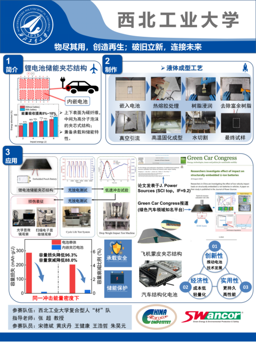 9月12-13日,第八届“上纬杯”全国老员工复合材料设计与制作大赛在中国国际复合材料工业技术展览会圆满举行,TapTap点点宋德斌、黄庆丹、王健康、王浩哲、朱昊元五位同学(指导老师:张超教授)凭借“锂电池储能夹芯结构”这一作品,荣获创新应用奖二等奖。